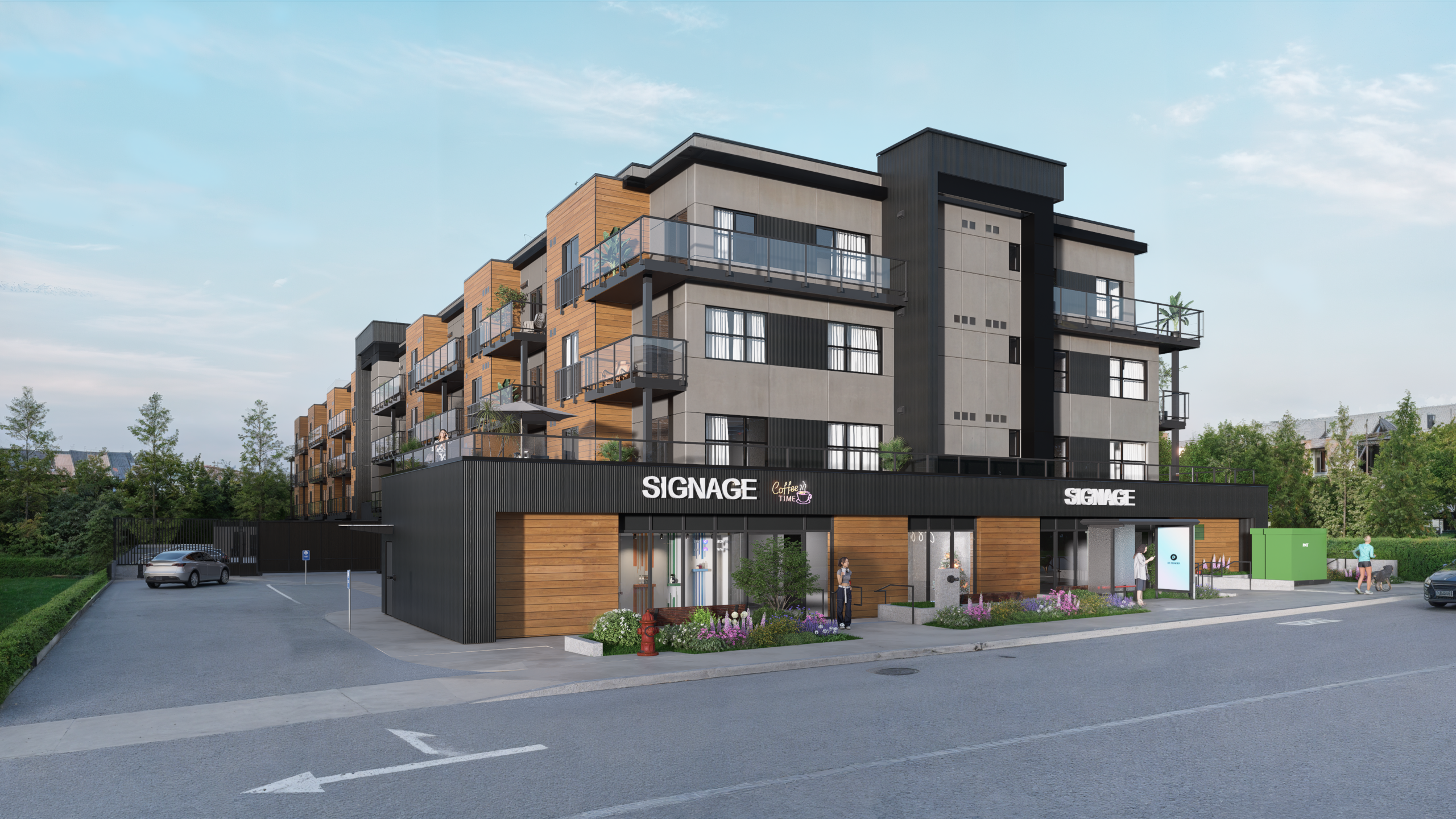 Gibbins Gate Apartments is an exciting mixed-use development at 3096 Gibbins Road, thoughtfully designed to bring modern rental living together with vibrant commercial space.